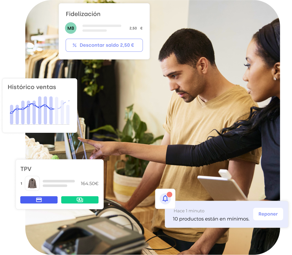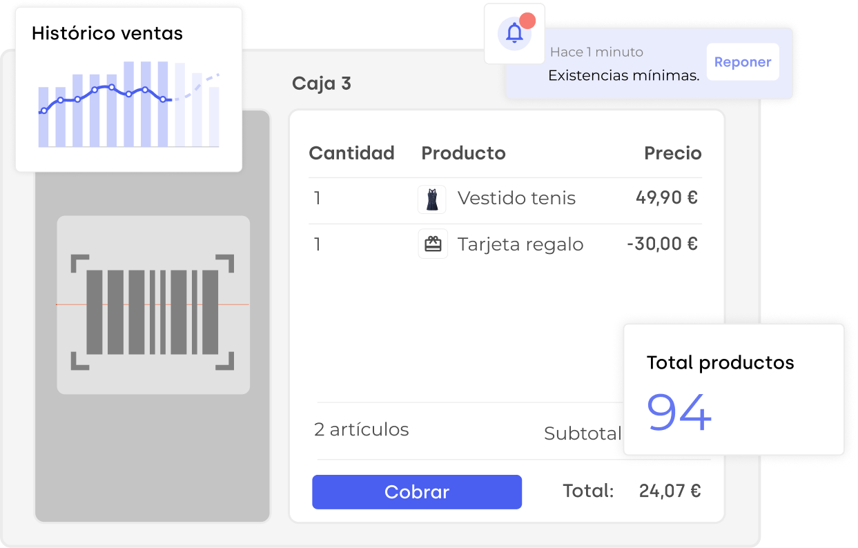 Consulta el estado del stock total o por canales de tienda y las ventas en un mismo panel, sin idas y vueltas de pantallas.